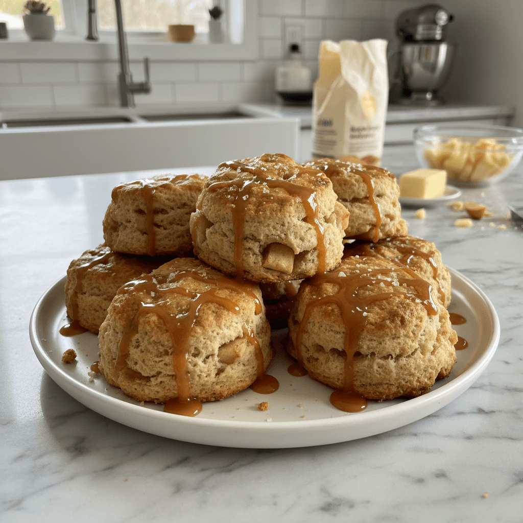 October 13, 2025 by Lucy Salted Caramel Apple Scones are my favorite fall bake! Flaky, tender, bursting with sweet apples and gooey caramel. A truly comforting treat for any morning.