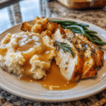 This recipe is pretty forgiving! If you don’t have fresh herbs, you can use dried, but use about a third of the amount. For the butter, I once tried a version with olive oil because my friend is dairy-free. It worked… kinda. The skin wasn’t as rich and crispy, but the flavor was still good! You can also mix up the herbs—add some parsley or marjoram if you have them. For the gravy, if you want a little extra something-something, you can deglaze the pan with a splash of white wine or sherry before you add the flour. It adds a really nice depth of flavor.