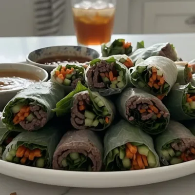 - Assemble Rolls: Set up your rolling station. Dip a rice paper wrapper in warm water until pliable, then lay it flat. Arrange lettuce, noodles, cucumber, cooked beef, and fresh Thai basil leaves. Tightly fold and roll your fresh Thai Basil Beef Rolls.