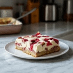 - Once your crust is slightly cooled, spread that beautiful cream cheese mixture evenly over it. Take your time here, a smooth, even layer makes for a prettier bar. Then, gently dollop spoonfuls of your cooled rhubarb mixture over the cream cheese. I like to swirl it a little bit with a knife for a pretty marbled effect, but a simple dollop works too. Don’t overmix it, though, or you’ll lose that distinct two-layer look. I learned that after getting a uniform pink layer once still tasty, but not quite what I was going for!